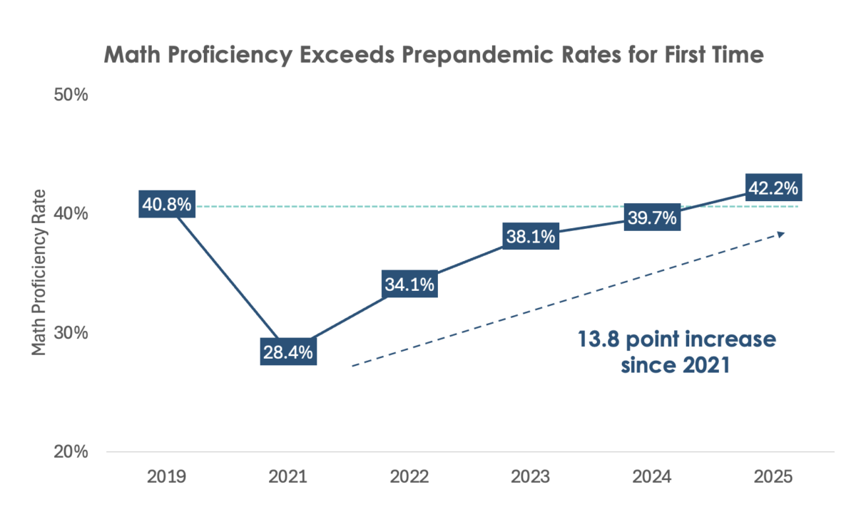 Statewide math proficiency in grades 3-8 has exceeded prepandemic levels for the first time, sitting at 42.2%, meaning 11,000 more students are proficient as compared to last year.