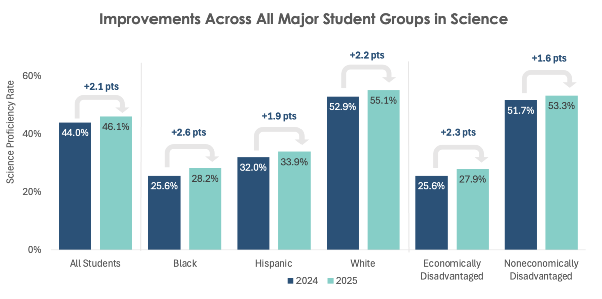 Statewide, proficiency rates grew by 2 percentage points in science in grades 3-8, and these gains are consistent across all major student groups.