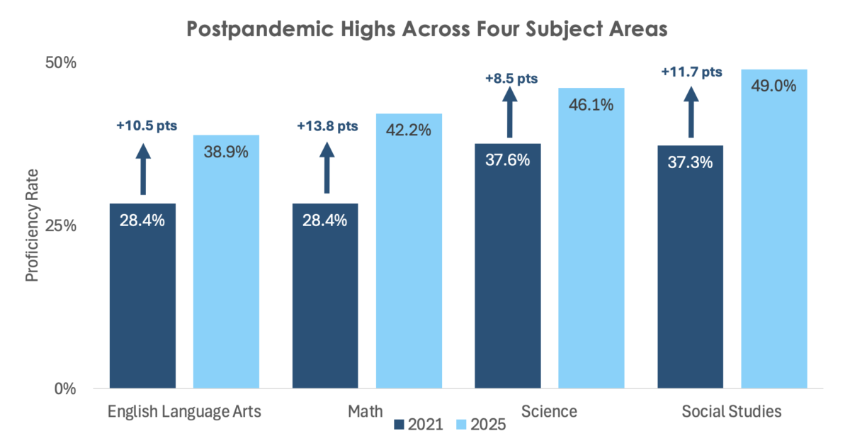 In grades 3-8, we have reached a postpandemic high in all four subject areas (ELA, math, science, and social studies).