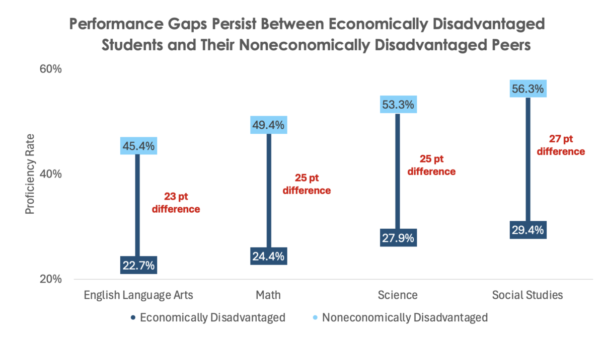 Across all grades and subject areas, large and concerning gaps persist between economically disadvantaged and noneconomically disadvantaged student groups.