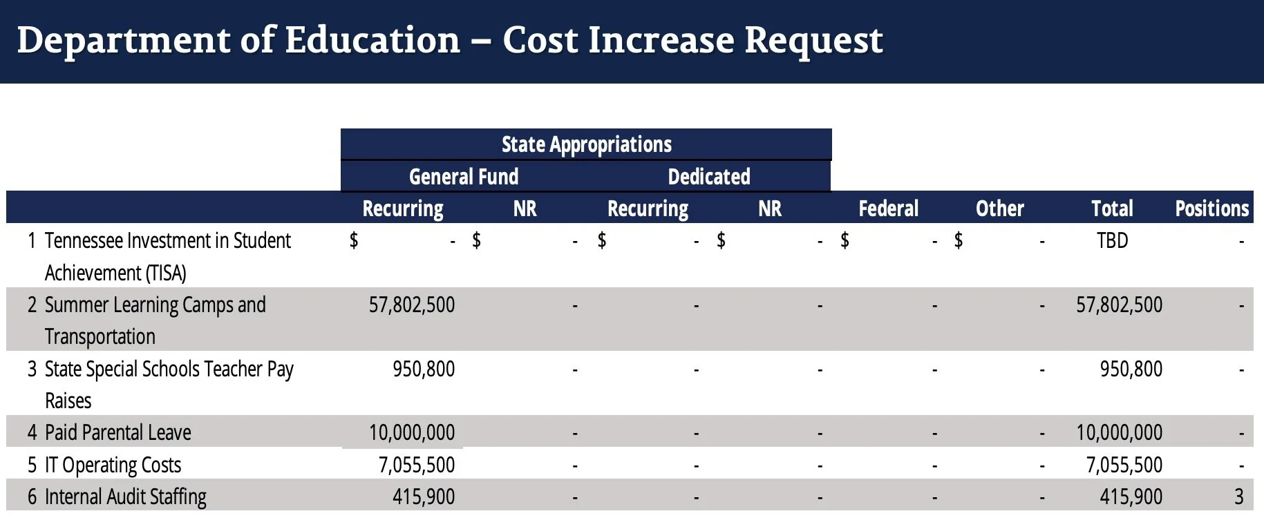 The department is also asking for an additional $950 thousand to increase salaries for educators at State Special Schools like the Tennessee School for the Blind, $10 million for paid paternal leave costs, and more than $7 million for IT expenses.