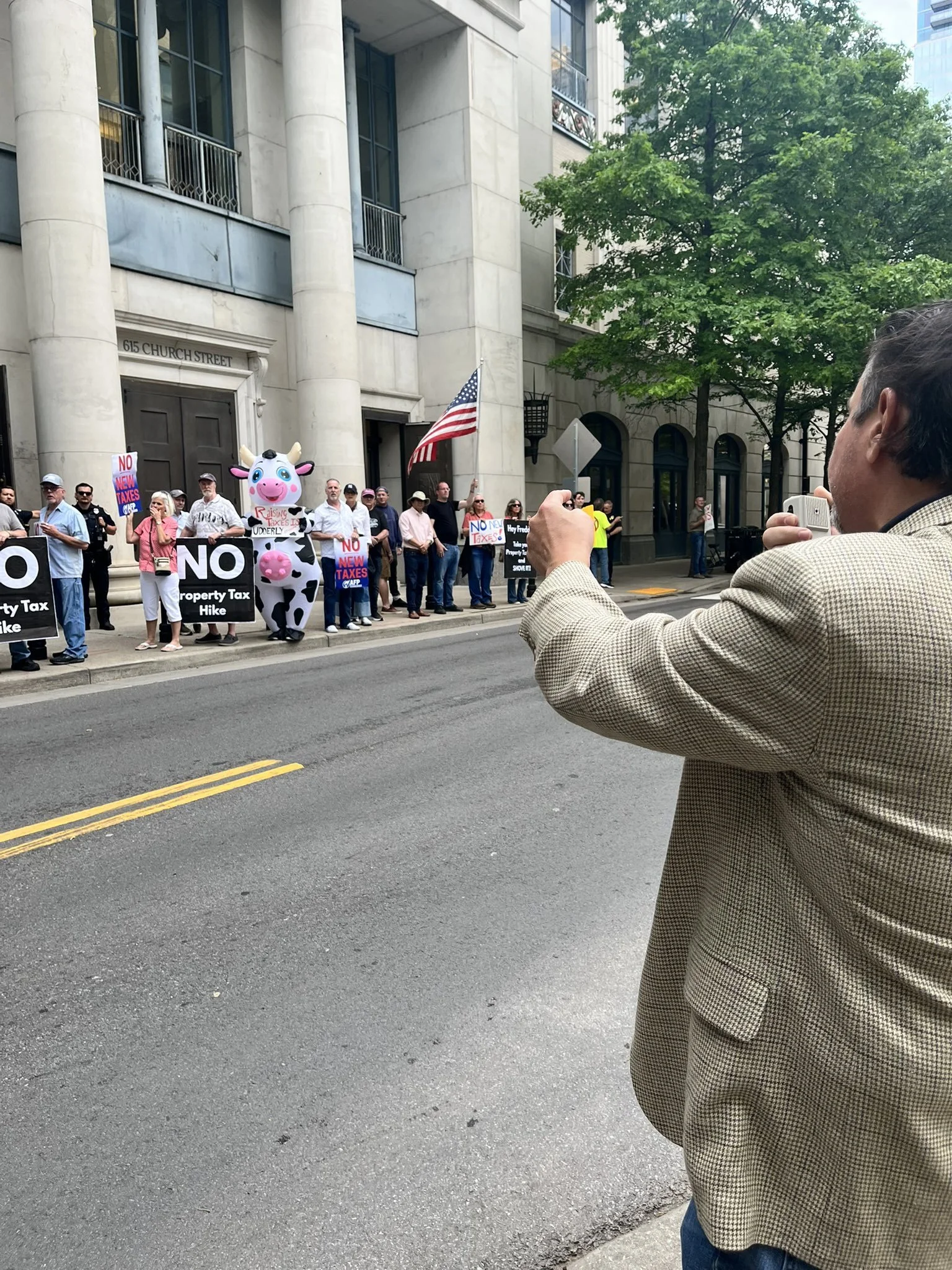 While O’Connell was giving his address at the downtown library, a coalition of conservative groups including the Nashville GOP, Americans for Prosperity Tennessee, and the Nashville Tea Party held a demonstration outside to oppose the mayor’s spending plan. Those groups argue that raising property taxes will make it more challenging for families to afford to live in Nashville.