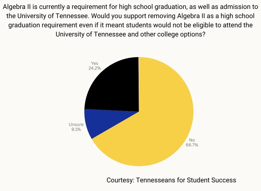 A new poll of 500 voters by education advocacy organization Tennesseans for Student Success found that most don’t want changes to Algebra II or EOCs. Of those surveyed, nearly 67 percent oppose removing Algebra II as a graduation requirement, compared to just 24 percent who supported it.