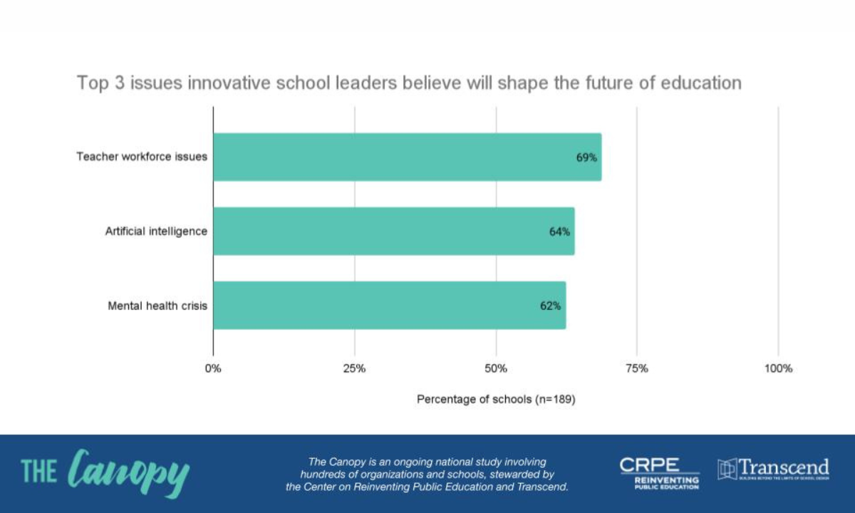 A common set of problems are keeping education leaders up at night: Will there be enough teachers to staff America’s schools? Can artificial intelligence enhance learning without deepening inequality? How can educators address the mental health crisis among young people? None of these have easy answers.New data confirm that these issues are top of mind for school leaders, and that education innovators are working to find solutions.